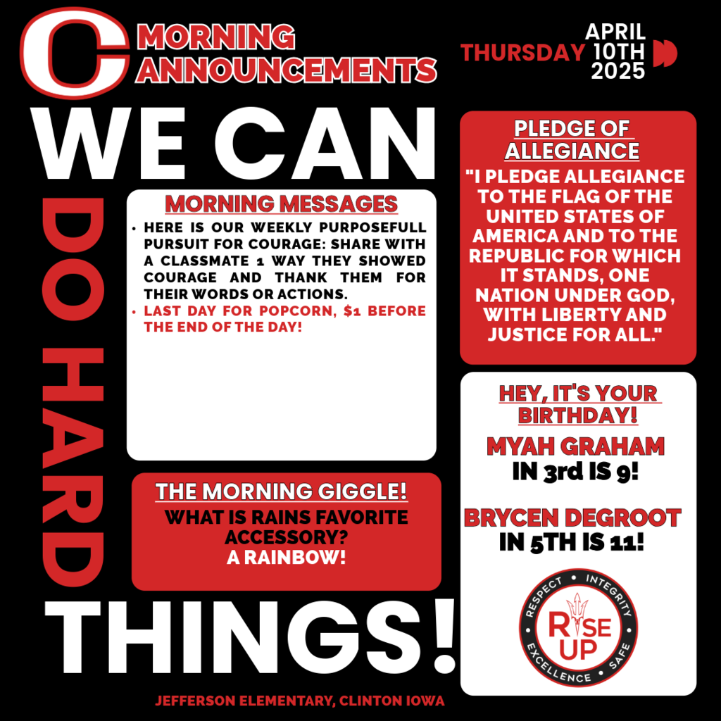 Welcome to Wednesday! Here are our Morning Announcements! #WeCanDoHardThings #Yes!WeCan!